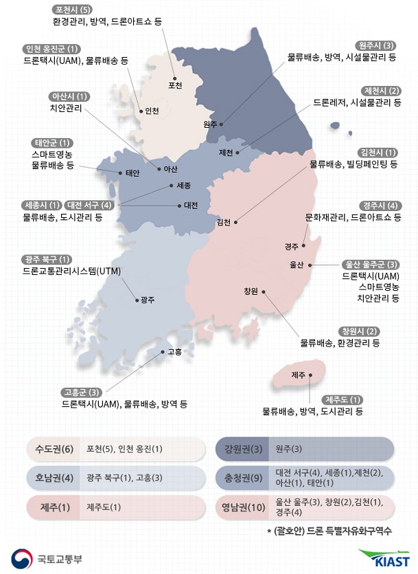최종 선정된 지자체를 주제별로 구분하면 ▲환경 모니터링(제주도, 경남 창원, 충남 태안) ▲드론 교통·물류배송(인천 옹진, 광주 북구, 전남 고흥) ▲시설물 점검(경북 김천) ▲안티드론(충남 아산) ▲방역(강원 원주) ▲행정안전·대민 서비스(울산 울주, 세종시, 대전 서구) 등이다.