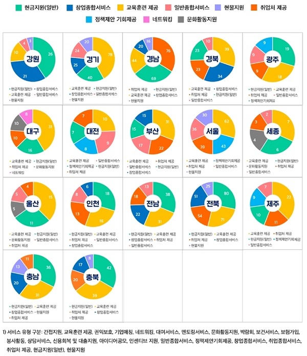 청년정책 정보를 기준으로 서비스 성격을 유형화한 결과 교육훈련 제공 정책 636개(21.7%), 현금지원 507개(17.3%), 취업처 제공 359개(12.3%), 창업 종합서비스 278개(9.5%), 일반 종합서비스 208개(7.1%), 현물지원 174개(5.9%)였다.