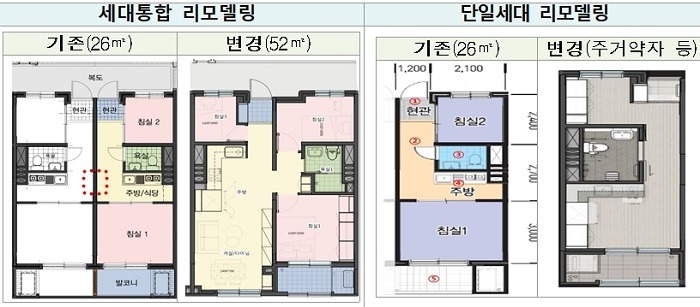 ‘세대통합 리모델링’은 연접한 소형 면적 주택(26㎡) 2세대의 비내력벽 철거를 통해 보다 넓은 주택(52m2) 1세대로 통합하는 사업으로, 리모델링 후 다자녀가구나 신혼부부 등에 공급한다.