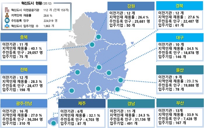 혁신도시는 코로나-19 등 어려운 여건에도 전반적으로 정주여건 등 수준이 개선되고 있다. 인구와 기업수가 증가하였으며, 학교, 병원 등 주민 편의시설도 확충되고, 지역인재도 목표비율 이상 채용됐다.