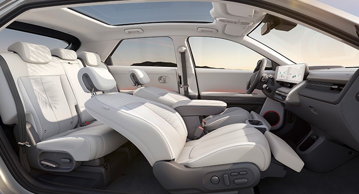 여기에 시트 등받이 및 쿠션 각도 조절로 무중력 자세를 만들어 주는 1열 운전석·동승석 릴렉션 컴포트 시트(다리받침 포함)와 최대 135mm 전방 이동이 가능한 2열 전동 슬라이딩 시트를 활용할 경우 아이오닉 5의 실내는 휴식 공간, 일하는 공간, 여가를 즐기는 공간 등으로 다양하게 변화시킬 수 있다.