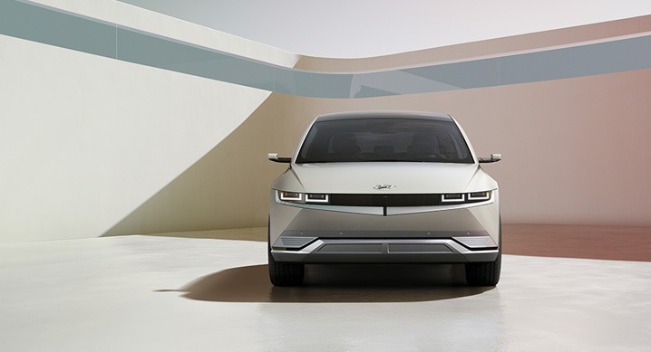아이오닉 5의 전면은 좌우로 길게 위치한 얇은 전조등이 인상적이며 현대자동차 최초로 상단부 전체를 감싸는 클램쉘(Clamshell) 후드*를 적용해 면과 면이 만나 선으로 나눠지는 파팅 라인을 최소화함으로써 유려하면서도 하이테크적인 이미지를 완성했다.