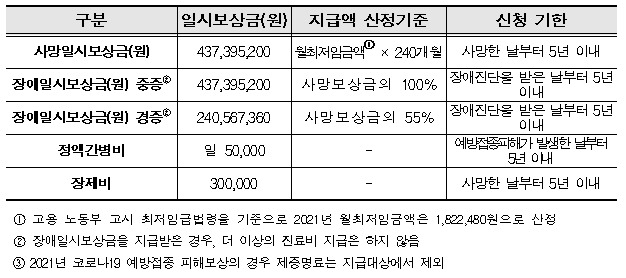 예방접종피해 국가보상은 진료비(본인부담금), 간병비(입원진료 시, 1일당 5만원), 장애일시보상금, 사망일시보상금 및 장제비가 지급된다.
