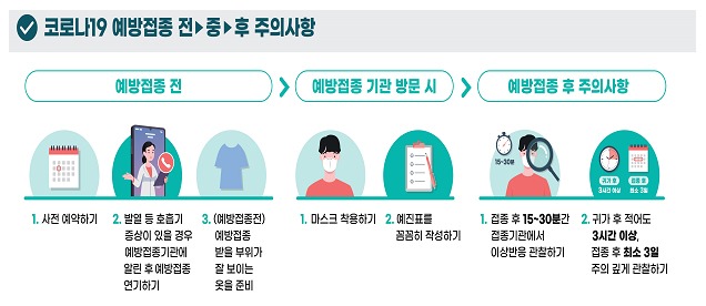 특히 안전한 예방접종을 위해서는 접종 전후 지켜야 할 안전수칙이 있다. 질병관리청 코로나19 예방접종 대응 추진단은 접종대상자와 의료진에게 ▲예방접종 전 ▲예방접종 시 ▲예방접종 후 다음과 같은 사항을 주의하도록 당부하고 있다.
