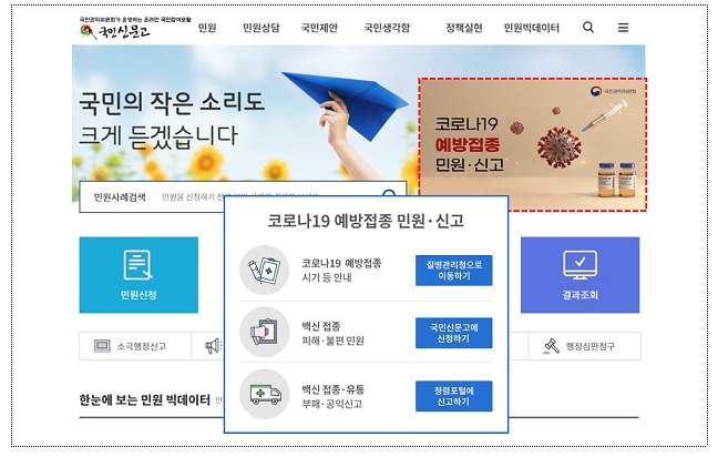 국민권익위원회는 지난달 26일 국민신문고 누리집(www.epeople.go.kr)에 코로나19 예방접종 관련 민원신청 및 공익신고 전용 창구를 개설했다고 2일 밝혔다.