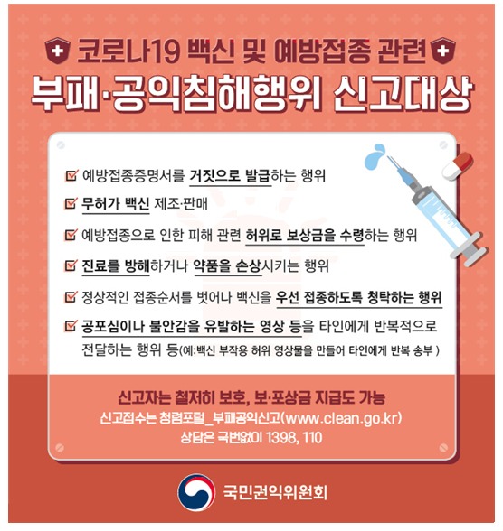 한편, 국민권익위는 ‘청렴포털 부패공익신고’ 누리집(www.clean.go.kr)을 통해 안전한 코로나19 예방접종을 저해하는 공익침해행위나 관련 부정청탁 등의 신고를 접수한다.