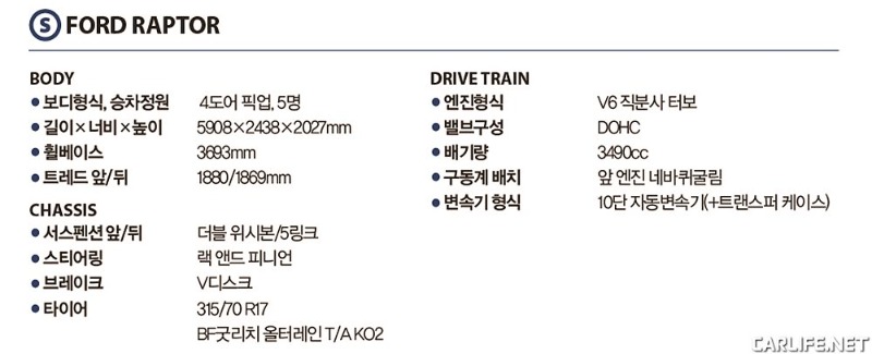 인테리어는 기본형과 큰 차이가 없으며 빨간색 스티치과 서포트, 스포츠 시트 정도가 다르다13세대 F-150이 알루미늄 보디를 사용한 덕분에 랩터 역시 227kg 경량화가 가능했다. 반대로 잃은 것도 있다. V8 엔진이 사라진 것. V6 3.5L 트윈터보 엔진은 450마력으로 매우 강력했지만 미국차에서 V8이 가지는 의미는 여전히 각별하다. 시대적 흐름에 따른 필연적 선택이었다 해도 마초 감성 넘치는 퍼포먼스 트럭에 8기통 엔진이 없다는 사실에 골수팬은 실망했다. 다행히도 포드는 이런 요구를 받아들여 V8 엔진을 얹은 랩터 R을 내년에 출시할 예정이다.