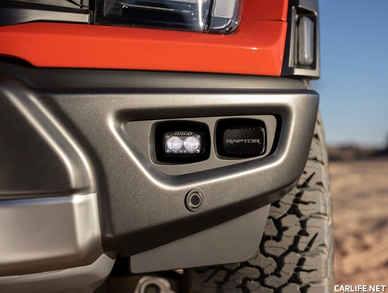 얼굴의 인상도 달라졌다. 신형 F-150은 프론트 그릴과 헤드램프를 경계면 없이 이어 붙인 디자인인데, 랩터는 그릴을 검은색으로 처리하면서 앞부분이 거대한 하나의 덩어리처럼 보인다. 게다가 엠블럼 대신 커다란 FORD 문자를 넣어 고성능 트럭에 어울리는 야성미를 뽐낸다. 범퍼 아래에는 튼튼한 스키드 플레이트를 장비해 혹독한 오프로드 주행에서 차체 하부를 보호한다.