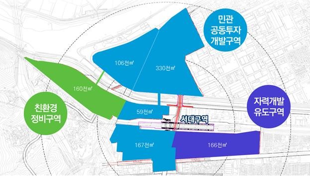자력개발유도구역은 역주변을 민간주도로 자율적으로 개발하여 생활여가 및 주거기능으로, 친환경 정비구역은 지속적인 공공시설의 친환경적인 정비와 함께 2030년까지 이 시설들을 이전하고 민자유치를 통한 주상복합타운으로 개발할 계획이다.