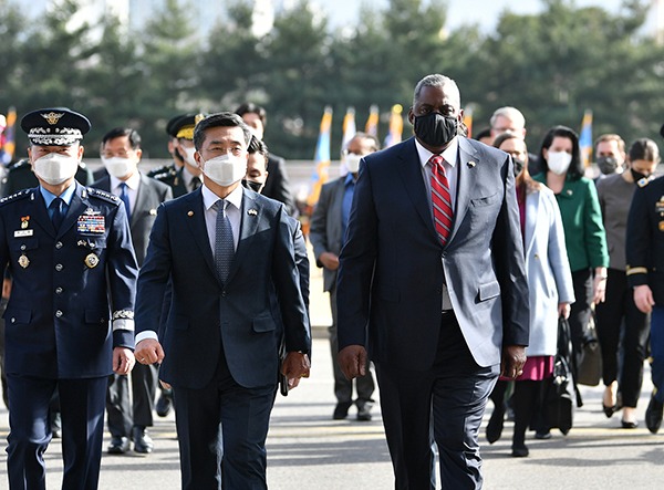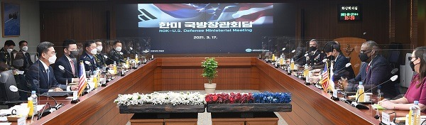 서욱 국방부 장관과 로이드 오스틴 미 국방부 장관은 이날 오후 서울 용산 국방부 청사에서 국방장관회담을 갖고 한반도 안보상황과 전시작전통제권 전환 추진 경과, 규칙에 기반한 국제사회 보호를 위한 역내협력, 한미일 안보협력 방안 등을 논의했다.