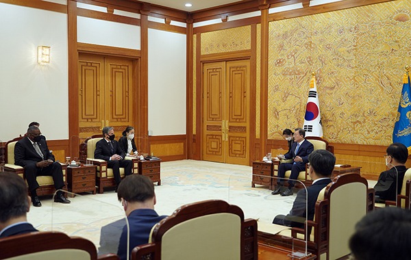 문 대통령은 “미국의 두 외교·안보 수장이 취임 후 우선적으로 함께 한국을 방문한 것은 한미동맹을 중시하는 조 바이든 대통령의 강력한 의지를 보여준 것”이라고 언급했다.