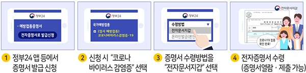 행정안전부는 질병관리청과 협력해 예방접종증명서에 코로나19 백신접종 항목을 포함하고, 정부24 앱에서 종이증명서뿐 아니라 전자증명서를 발급하는 서비스를 지난 2월 26일부터 시행하고 있다고 22일 밝혔다.