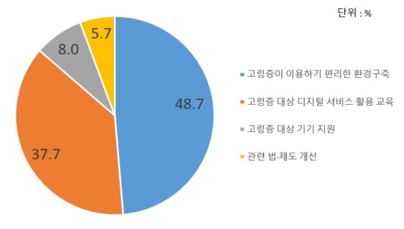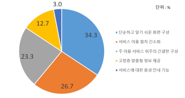 설문조사는 서울 거주 65세~79세 300명을 대상으로 이뤄졌다. 디지털 기기·서비스 개선방안으로는 ‘단순하고 알기 쉬운 화면구성(34.3%)’, ‘서비스 이용절차 간소화(26.7%)’, ‘주 이용 서비스 위주의 간결한 구성(23.3%)’ 순으로 응답했다. 모바일 웹‧앱과 영상콘텐츠 모두 가장 불편하다고 느끼는 요소는 ‘용어’(모바일 웹‧앱 51.3%, 영상콘텐츠 57.9%)로 나타났다.