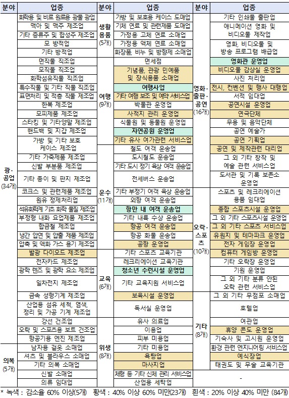 매출 감소율이 60% 이상으로 300만원을 받는 업종은 여행사, 영화관, 자연공원 운영업, 청소년 수련시설 운영업, 항만 내 여객 운송사 등 5개다.
