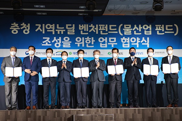 중소벤처기업부는 29일 한국수자원공사 본사에서 한국벤처투자, 한국수자원공사, 대전광역시, 세종특별자치시, 충청북도, 충청남도와 ‘충청 지역뉴딜 벤처펀드(물산업 펀드)’ 조성과 벤처투자 활성화를 위한 업무협약을 체결했다고 밝혔다.