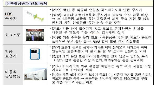 이를 위해 중동·아프리카·CIS·중남미 등 신흥 유망시장을 대상으로 집중 수요발굴 및 방역물품 ODA 등을 통한 수출을 촉진한다.