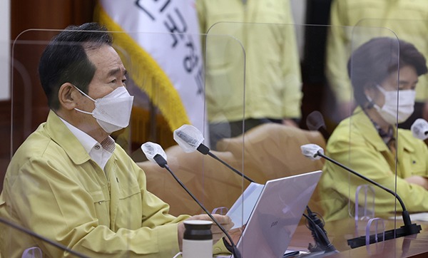 이날 코로나19 대응 중앙재난안전대책본부 회의를 주재한 정 총리는 “코로나19 하루 확진자 수가 500명대로 올라선 후, 좀처럼 떨어지지 않고 있다”며 “코로나19의 전방위적인 공세에 한시도 긴장을 늦출 수 없는, 실로 일촉즉발의 위태로운 상황”이라며 이 같이 말했다.
