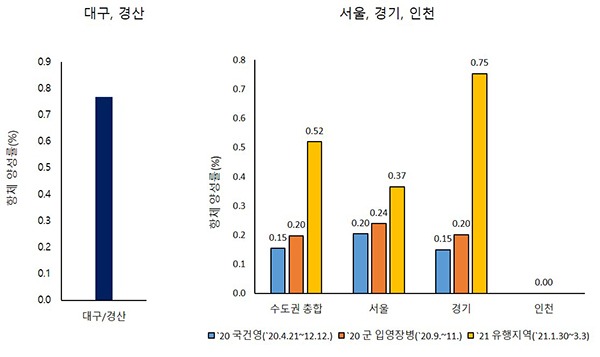 이 결과에 따르면 서울·경기·인천 등 수도권 지역 의료기관 방문자 5002명 중 26명(0.52%, 서울 7명, 경기 19명)이, 육군 훈련소 입영 장정 1만 253명 중 21명(0.2%, 기확진 13명)의 항체양성자를 확인했다.