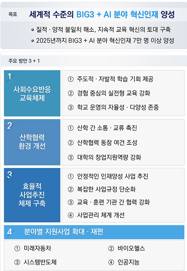 빅3는 혁신성장산업으로 집중 육성 중인 미래차·바이오헬스·시스템반도체 분야로, 이를 위해 정부는 사람투자·인재양성 협의회 산하 특별팀(TF)을 운영해 관련 정책을 점검하고 기업·대학 등 현장 의견을 수렴했다.