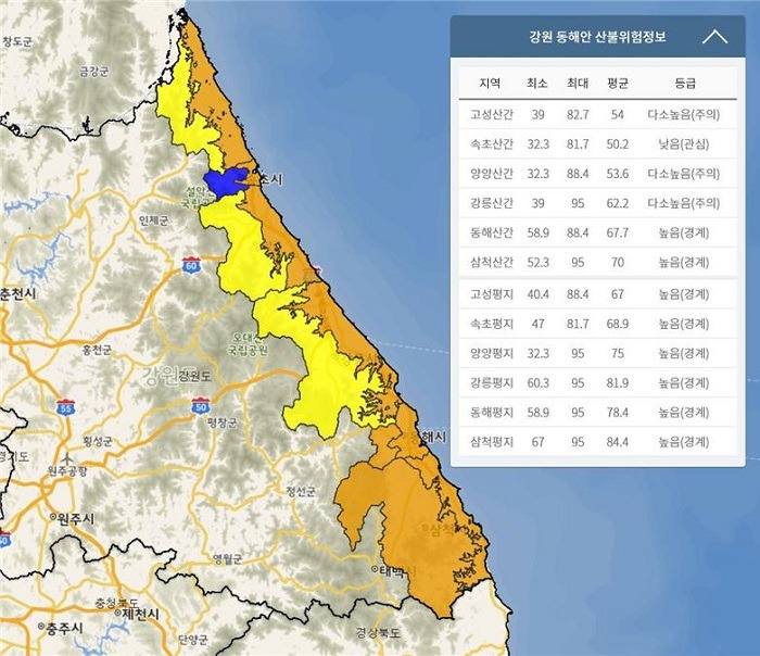 산림청 국립산림과학원은 오는 19일(월)과 20일(화)에 강원 영동, 경북 북동산지 및 동해안 지역에 10-16m/s의 강풍이 불고, 순간최대풍속이 20m/s 이상의 거센 바람이 예상됨에 따라 대형산불위험예보를 발령하였다.