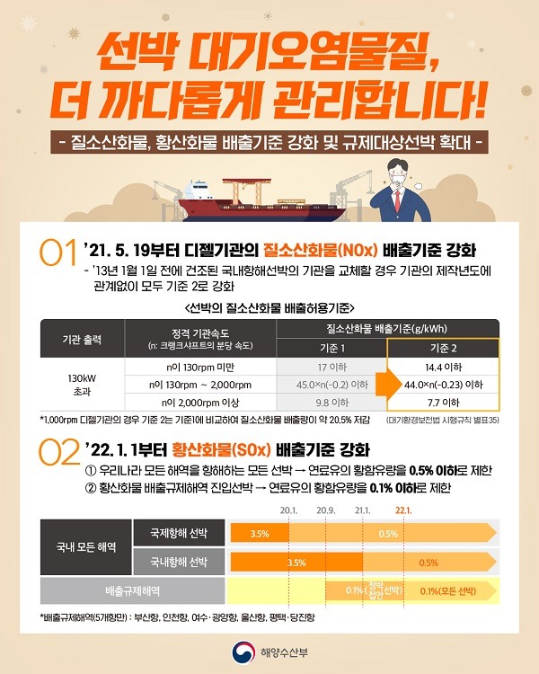 한편, 질소산화물과 함께 선박에서 배출되는 대기오염물질의 하나인 황산화물(SOx)과 관련해서는 국제항해 선박은 2020년 1월부터, 해양오염방지설비를 갖춘 국내항해 선박은 올해 설비 검사일부터 선박연료유의 황함유량 기준을 기존 3.5%에서 0.5%로 대폭 강화하였다. 이 기준은 내년 1월 1일부터는 모든 선박에 적용되도록 하여 황산화물 배출을 지속적으로 저감할 수 있도록 하고 있다.