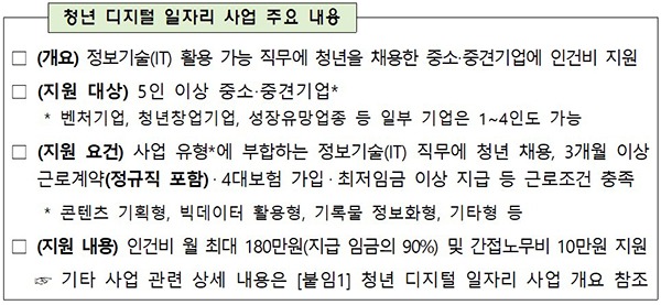 정부가 정보기술(IT) 활용 가능 직무에 청년을 채용한 중소·중견기업에 인건비 등을 지원하는 ‘청년 디지털 일자리’ 사업을 확대한다.