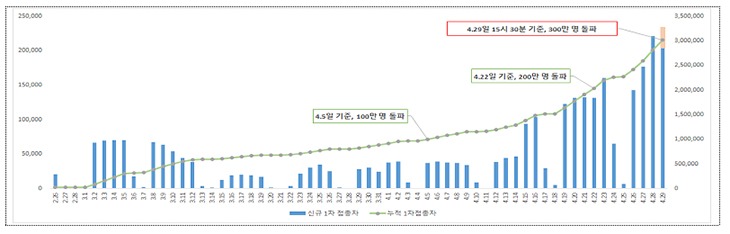지난 2월 26일 접종을 시작한 이후 39일만인 이달 5일 100만명을 넘었고, 이로부터 17일이 지난 22일 200만명을 돌파했다. 200만명에서 300만명으로 늘어나기까지는 1주일이 걸려, 접종 속도가 점차 빨라지고 있다.