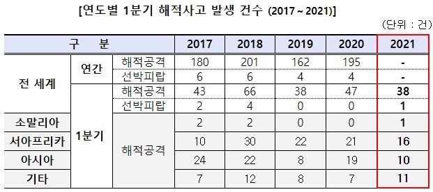 2021년 1분기 해적사고는 전년 같은 기간(47건)에 비해 약 19% 감소한 38건이 발생하였으나, 피랍 선원은 40명으로 전년 같은 기간(22명)에 비해 큰 폭으로 늘어난 것으로 나타났다.