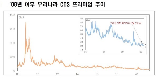 우리나라의 국가 부도 위험을 반영하는 지표인 신용부도스와프(CDS) 프리미엄이 글로벌 금융위기 이후 최저치를 기록했다.