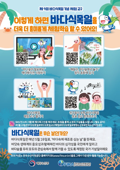 한편, 올해 바다식목일을 기념하며 더 많은 국민들이 바다식목일을 즐길 수 있도록 사전에 13개* 시·도의 어린이집, 유치원을 대상으로 수요조사를 실시하였으며, 추첨을 통해 ‘바다숲 탐험하기’ 등 5개 종류의 체험교구 1만 5천 개와 바다숲 애니메이션, 창작동화 등의 교육 프로그램을 제공할 계획이다.