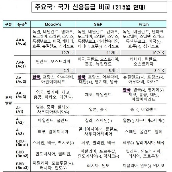 기획재정부는 12일 무디스가 한국의 국가신용등급과 전망을 기존 수준(Aa2, 안정적)으로 유지했다고 밝혔다. 이는 아시아 국가 중 싱가포르에 이어 두 번째로 높은 등급이다.