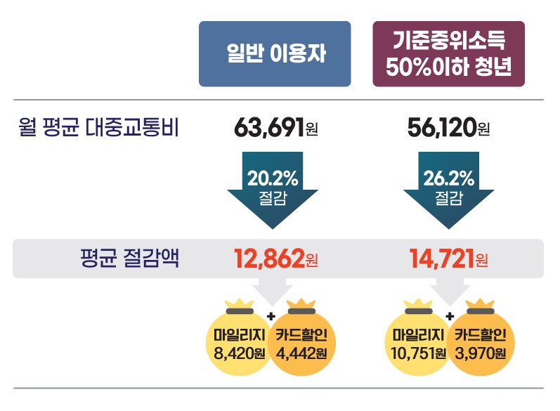 특히 마일리지가 추가로 지급되는 기준중위소득 50% 이하 청년(만 19세~34세)들은 월 평균 14,721원(마일리지 10,751원, 카드할인 3,970원), 대중교통비의 26.2%를 절감한 것으로 분석되어 대중교통비 부담이 크게 경감된 것으로 나타났다.
