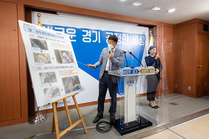인치권 경기도 특별사법경찰단장은 17일 도청에서 기자회견을 열고 “지난 3월 15일부터 4월 9일까지 의정부시, 양주시, 동두천시 등 도 북부 3개 지역 산지 무단 훼손 의심지 430필지에 대한 현장단속을 실시해 산지관리법 위반행위 20건을 적발했다. 훼손면적은 축구장 면적(7,140㎡)의 3.5배 규모인 약 2만5,304㎡(7,700여평)에 이른다”고 밝혔다.