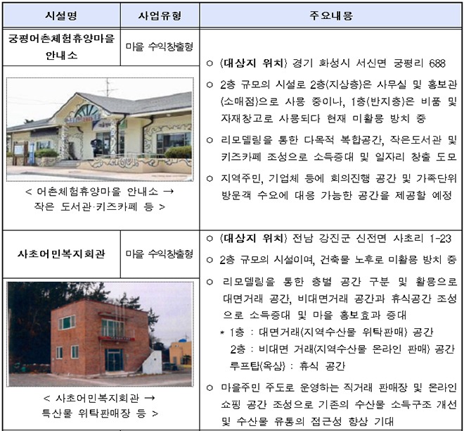 올해 선정된 사업대상지 중 ‘경기 화성 궁평마을’은 누수 등으로 방치된 어촌체험휴양마을 안내소 1층을 ‘다목적 문화공간’, ‘작은도서관’, ‘키즈카페’ 등으로 조성할 계획이다.