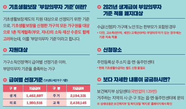다만 부양의무자인 직계혈족(부모, 자식) 가구가 고소득(1억 원 초과), 고재산(부동산 9억 원 초과) 기준을 초과할 경우 부양의무자 기준은 계속 적용하게 된다.