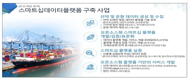 조선·해운은 12개 기관·기업이 협업, 스마트 선박과 관제센터 등에서 생성되는 데이터를 표준화해 수집·공유·활용하는 플랫폼을 구축할 계획이다. 이를 기반으로 스마트 선박 고도화, 엔진 등 주요 부품 예지보전, 탄소 배출 저감 및 연료절감을 위한 운항 지원 서비스 등이 가능해질 것으로 기대되고 있다.