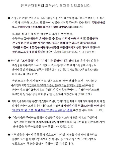 이에 은평구청 홈페이지에는 위 내용과 관련되어 주민들의 알 권리를 위하여 언론중재위원회 조정 신청 결과를 게시하여 누구나 확인이 가능하도록 하였으며, 그 내용은 다음과 같다.