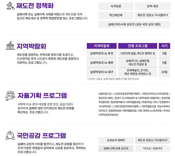 또한 2019년부터는 재도전을 격려하고 지지하는 문화를 전국으로 확산하기 위해 지역박람회를 개최했으며, 지난해에는 민간·공공기관이 참여하는 자율기획프로그램을 신설해 현장 수요를 바탕으로 참여 규모를 전국으로 확대해 우리 사회의 인식을 변화시키고자 노력하고 있다.