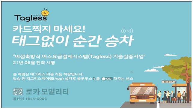 ‘비접촉 요금결제 서비스’는 스마트폰에 ‘태그리스 페이-앱’을 설치 후 선·후불형 교통카드를 등록하면, 버스 승하차 시 교통카드 단말기에 별도 카드 접촉(태그)없이 자동으로 승하차 처리 및 결제가 이루어지는 서비스다.