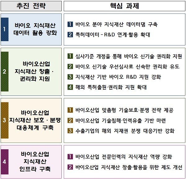 정부는 바이오산업의 지식재산 경쟁력 강화를 위해 바이오분야 지식재산 데이터댐 구축과 바이오산업 핵심특허 창출 확대 등을 목표로 ▲바이오 지식재산 데이터 활용 강화 ▲바이오산업 지식재산 창출·권리화 지원 ▲바이오산업 지식재산 보호·분쟁 대응체계 구축 ▲바이오산업 지식재산 인프라 구축 등 추진전략을 마련했다.