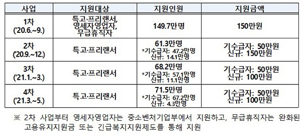 한편 긴급고용안정지원금은 4차례 시행으로 현재까지 총 179만 2000명에게 3조 4000억 원을 지원했으며, 1차 긴급고용안정지원금부터 지원을 받은 경우에는 최대 300만원 지원을 받게 된다.