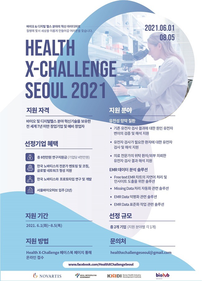 서울시는 한국노바티스, 한국보건산업진흥원과 공동으로 바이오 및 디지털헬스 분야의 우수기업을 발굴하는 제2회 ‘헬스엑스챌린지 서울(Health X-Challenge Seoul)’을 공동 개최한다고 밝혔다.