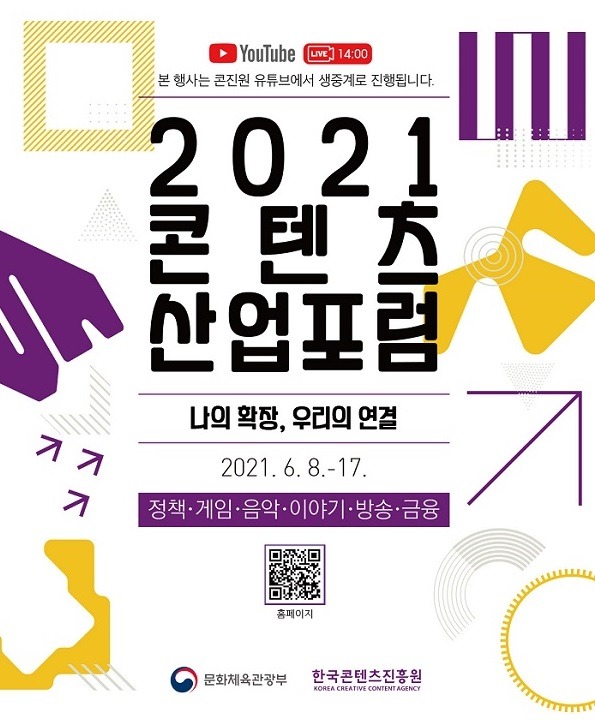 문화체육관광부와 한국콘텐츠진흥원(이하 콘진원)은 ‘2021 콘텐츠산업포럼’을 오는 8일부터 10일, 15일부터 17일까지 총 6일 간 개최한다.
