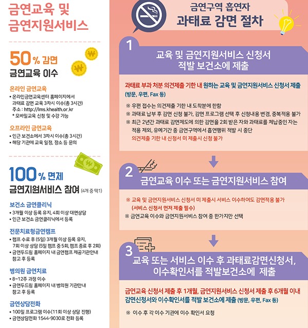 이에 따라 과거에는 금연구역 내에서 흡연할 경우 과태료만 부과했으나, 지난해 6월부터 위반자가 금연교육 및 금연지원서비스에 참여하면 과태료를 감면받고 금연할 수 있는 동기도 부여할 수 있도록 했다.