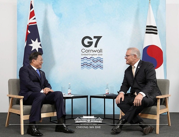 두 정상은 한국과 호주가 G7 정상회의에 함께 초청받은 것을 환영하고, 포스트 코로나 시대의 다양한 글로벌 현안 해결에 있어 양국의 역할에 대한 G7 국가들의 높은 기대감을 보여주는 것이라고 평가했다.