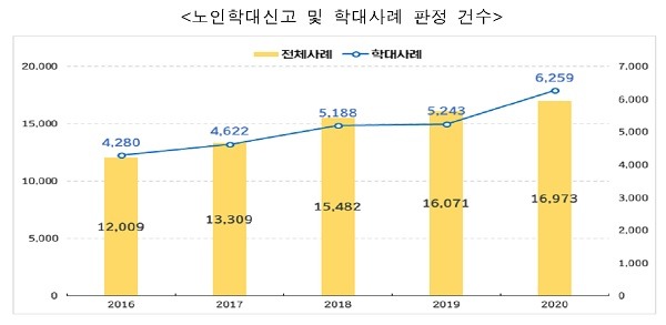 보건복지부가 제 5회 노인학대 예방의 날인 15일 발표한 2020 노인학대 현황 보고서에 따르면 전국 34개소 노인보호전문기관이 지난해 접수한 노인학대 신고 건수는 1만 6973건으로 2019년(1만 6071건) 대비 5.6% 증가했다. 이 중 학대 사례로 판정된 건수는 6259건으로, 이는 2019년의 5243건보다 19.4% 증가했다.
