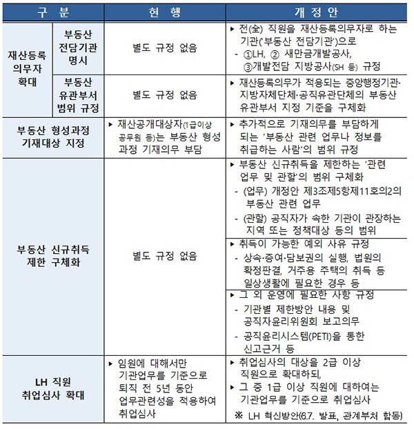 이번 개정안은 한국토지주택공사 사태 이후 공직을 이용한 부동산 투기를 원천적으로 차단할 목적으로 지난 4월 개정·공포한 공직자윤리법(이하 ‘개정법’)을 구체화한 것이다.