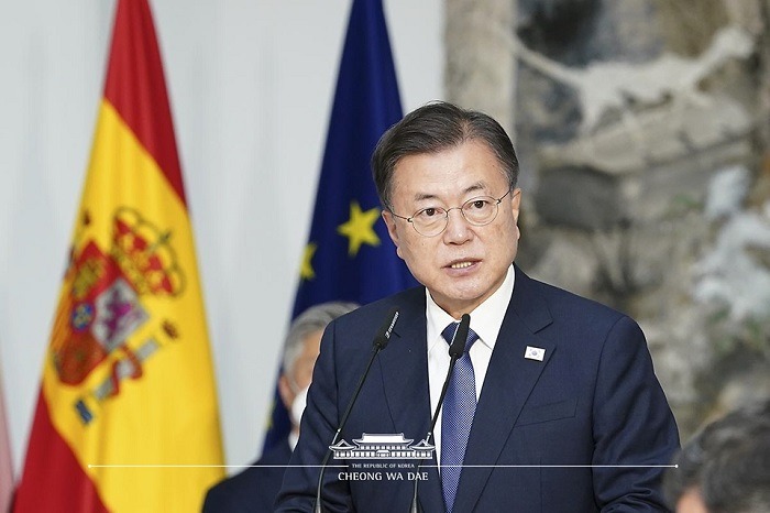 문 대통령은 “스페인은 지난해부터 ‘디지털 스페인 아젠다 2025’와 ‘2050년 탄소중립 전략’을 통해 대규모 투자에 나섰다”며 “한국 역시 디지털 뉴딜과 그린 뉴딜을 중심으로 2025년까지 1200억 유로를 투입하는 ‘한국판 뉴딜’을 추진하고 있다”고 소개했다.