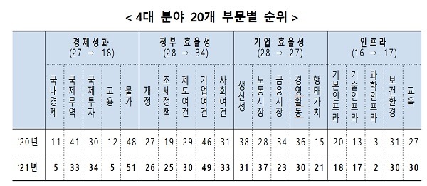 한국은 4대 분야 중 ‘경제 성과’와 ‘기업 효율성’에서 작년보다 높은 순위를 기록했으나 ‘정부 효율성’과 ‘인프라’에서는 순위가 내려갔다.