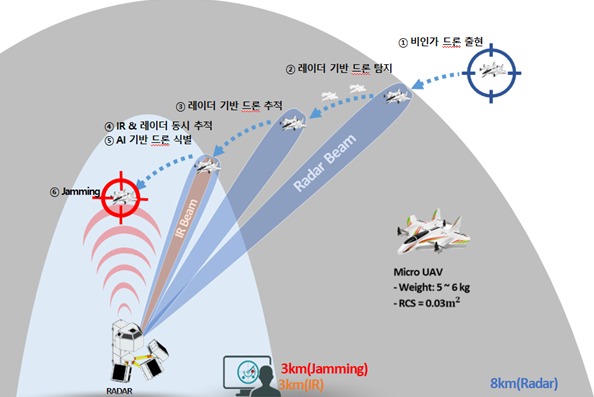 「레이더(RADAR) 연동 안티드론 통합솔루션」은 초소형 드론을 탐지, 식별, 전파교란 단계를 거쳐 작동 불능 상태로 만들어 미상의 드론이 군 중요시설에 접근하는 것을 차단한다.
